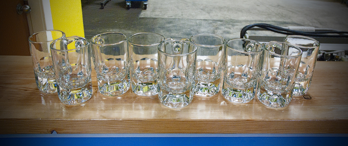 Turns out, they were open. The brewer saw our panicked looks through the window and opened up, saying he’d wait a few minutes before starting the tour in case others showed up. No prob. You’d never guess what the interior of this place looked like if you had just passed by. Bright, screaming colors contrasting the gleaming stainless brew tanks. Very energetic. A row of glasses lined up waiting to be filled.