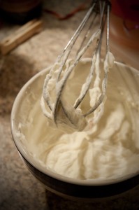 Chill a whisk and bowl (preferably metal… I only had ceramic) in the freezer for about 20 minutes before you start. It’ll help keep the cream cold as you’re whipping. The cream can just be in the fridge. Whip it (there’s no avoiding the Devo joke here).