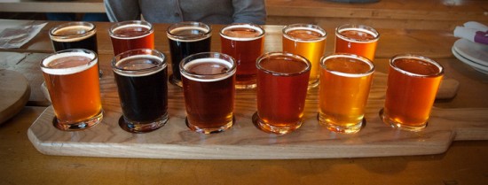 While I’m sure this place is a touristy nightmare in the summer, during the darker months it was distinctly filled with locals. There was a mix of blue-collar men, most of whom were bearded, and donned hoodies, faded baseball caps, or both. The other variety of client was of the older Yankee couple category, chewing slowly and glaring at everyone around them. Most of the patrons stared distractedly at the Bruins game on one of the many TVs, erupting into cheers and slapping the bar with every Bruins goal, or amused themselves with pub games. One in particular involved a wall-mounted hook, and a metal ring hanging from a length of rope. The object was to swing the ring in a pendulum arc so that it catches on the hook. A ridiculously simple task, yet maddeningly difficult to achieve. There also appears to be some sort of “mug club” for this place, as a couple hundred thick ceramic mugs dangled above the bar, no doubt awaiting the return of their owners. Doing our best to shut out the racket of the hockey fans, and avoid the icy stares of the memento mori Yankee geezers, we delved into a beer sampler. Cape Ann pours a paddle of six beers in the standard 4-5oz size. There were about 11 house brews offered in the menu, so we made our choices and set to work.