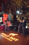 the machine room, and we sidled up to one to get a few drinks. I led off with a Mojito (pre-mixed, but Mojitos are a pain to make) and the Lady Friend went with the Rough Rider, the whiskey cocktail. After our traditional Bully Boy cheer “BULLY!” We took in the small details while sipping our drinks: the cigarette candle holders (real cigs… I checked), Bully Boy branded coasters, match books and empty liquor bottles as flower vases, all arranged on wooden casks. The Bully Boy logo projected brightly onto the machine room floor, and the guests, some decked-out in Prohibition-era attire, meandered in to clutch highball glasses and stare at the mechanisms looming above.