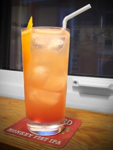 UPDATE: So, I made another one. Tried the Collins version, which means basically making hte original recipe, pouring into a tall/chimney/highball/Collins glass filled with ice, and topping with soda water. Disclaimer… the recipe makes rather a lot of liquid. Two ounces of booze and another two ounces of fruit juice, plus a splash of grenadine and some water (water is added to a cocktail through dilution when you shake or stir a drink. It’s pretty important). So in my ice-filled collins glass, it came pretty much to the top. No problem… just take a heavy quaff and make some room for the soda water. I took the level down by about 1/4 to allow for some bubbly fizzy wizzbang water. Another big swath of orange peel (trim off as much of the white pith as possible) for a garnish and a straw. Yes, Rule 48 of the 86 Rules of Boozing states that “Men don’t drink from straws. Unless you’re doing a Mind or Face Eraser” though I take that rule with a bit of flexibility for tall drinks which need the straw to a) stir occasionally and b) drink the bottom depths of the drink without getting a face full of ice.