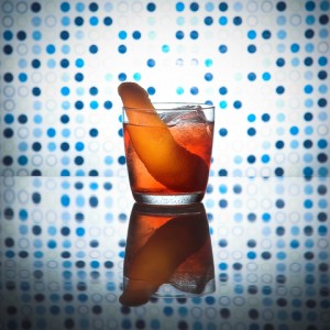 Dump it all into a mixing glass filled with ice. There’s no fruit juice here, so it’ll be STIRRED. Strain into a double Old Fashioned glass with a large chunkola of ice. Garnish with a flamed orange peel.