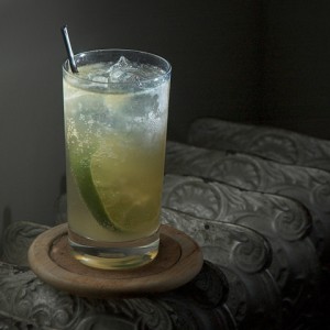 “Fill 8 oz. highball glass with carbonated water and stir. Leave lime in glass.”